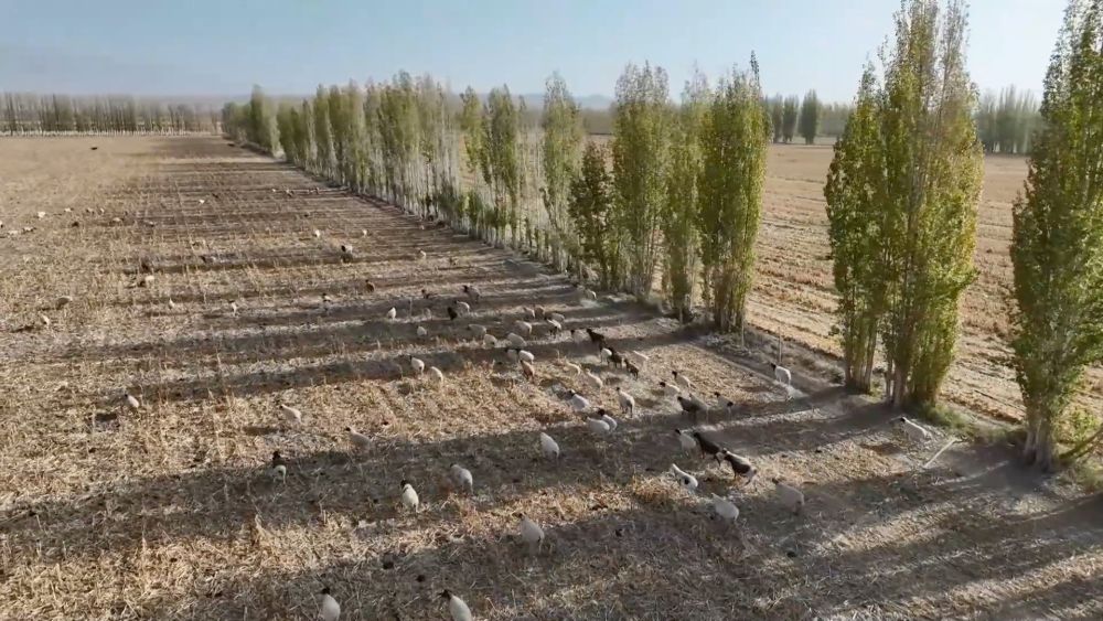 在新疆和硕县,随着农田作物采收逐步完成,残留秸秆地里迎来了一批批新的“食客”。