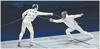 运动员在十五运会击剑项目男子重剑个人决赛中。本报记者 王亮 摄