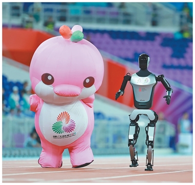 十五运会赛场,吉祥物与机器人互动。本报记者 陶相安 摄