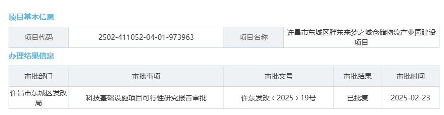 记者注意到,胖东来梦之城仓储物流产业园建设项目可行性研究报告,已于2月23日通过许昌市东城区发改局审批。