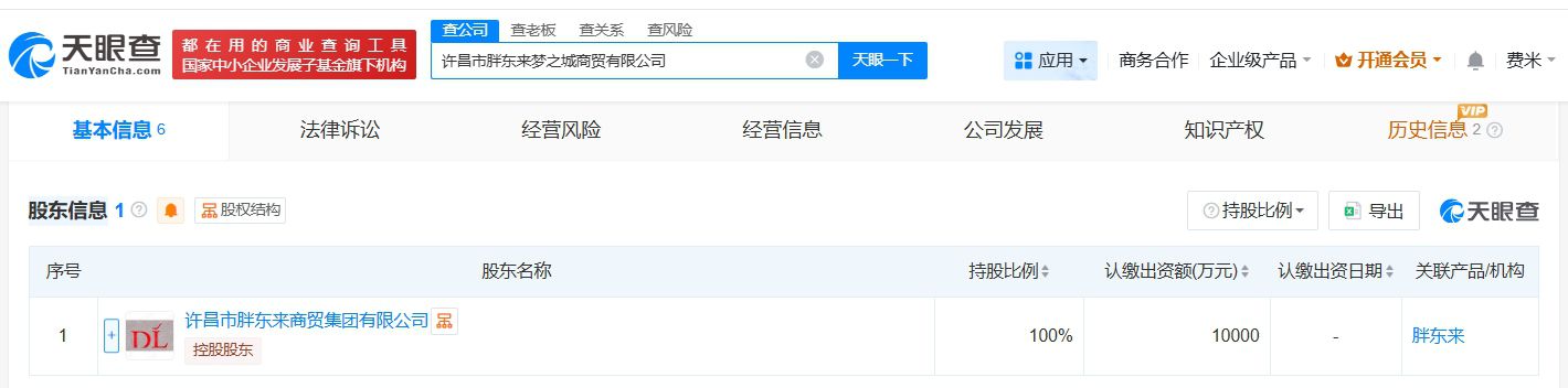 股东信息显示,该公司由许昌市胖东来商贸集团有限公司全资持股。