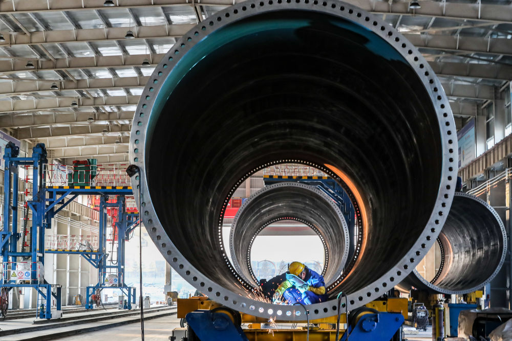 11月20日,在甘肃省酒泉经济技术开发区的中国水电四局(酒泉)新能源装备有限公司塔筒制造车间,工作人员进行风机塔筒焊接作业。新华社记者 郎兵兵 摄