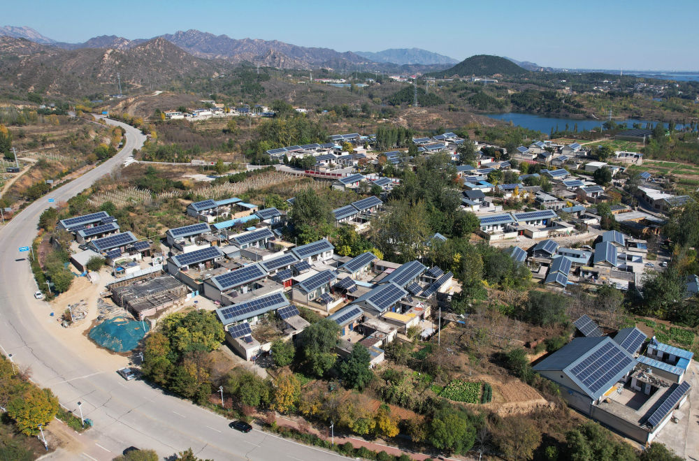 11月2日拍摄的河北省平山县西柏坡镇北庄村兆瓦级“光储”智能微电网示范工程项目中的屋顶光伏发电板(无人机照片)。新华社记者 杨世尧 摄