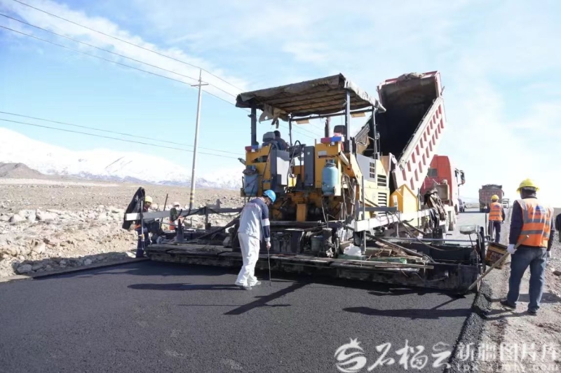 10月17日,哈密市天山南坡乡镇连接线(二期)工程建设项目二标段的施工现场,摊铺机正有条不紊地摊铺沥青路面。杨宏建摄