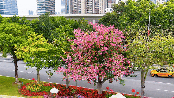 广州,异木棉粉若云霞,与现代化的玻璃幕墙大厦、整齐的道路构成绝佳的城市风景。图源:文明南沙