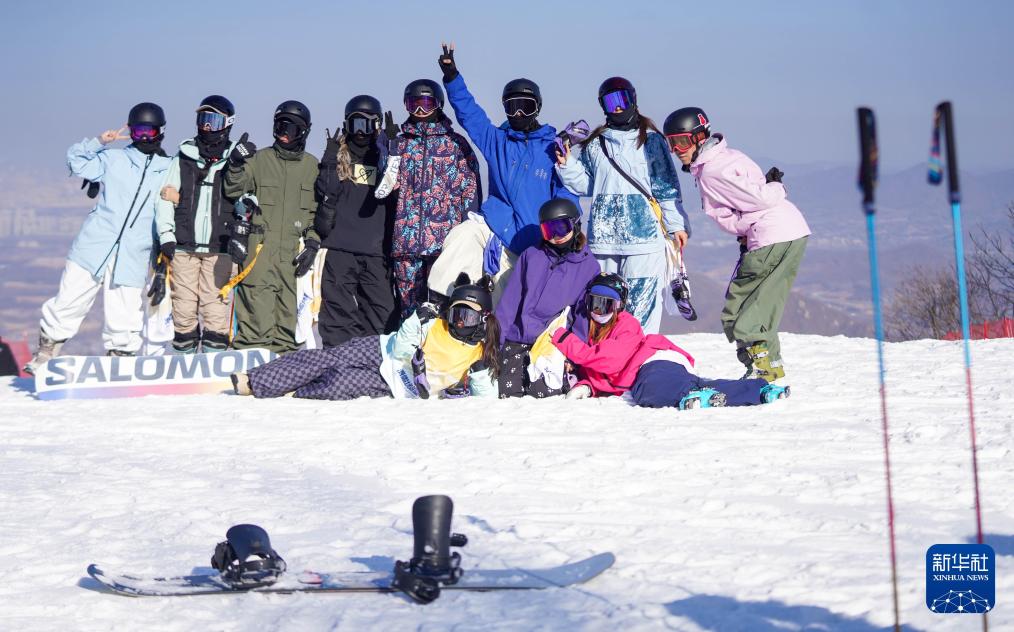 2025年1月27日,几名滑雪爱好者在新疆丝绸之路山地度假区合影留念。新华社记者 王菲 摄