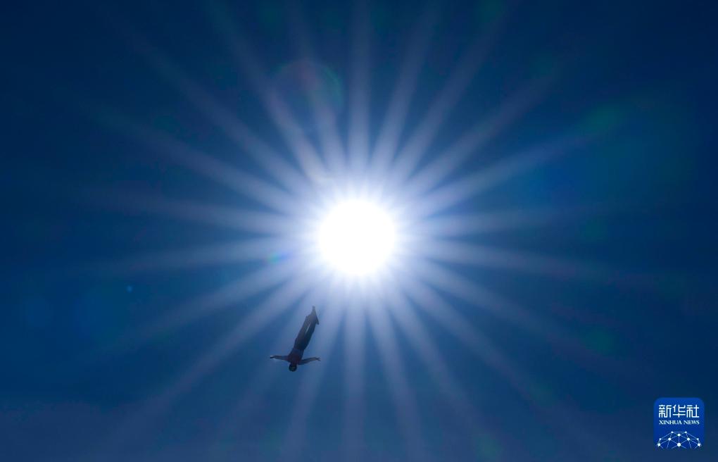 2012年1月7日,第12届全国冬季运动会自由式滑雪空中技巧规定动作的比赛在吉林市北大壶滑雪场举行。图为齐齐哈尔市队的女选手孔凡钰在比赛中进行空中翻转时,仿佛从太阳的光晕上滑下来。新华社记者 费茂华 摄