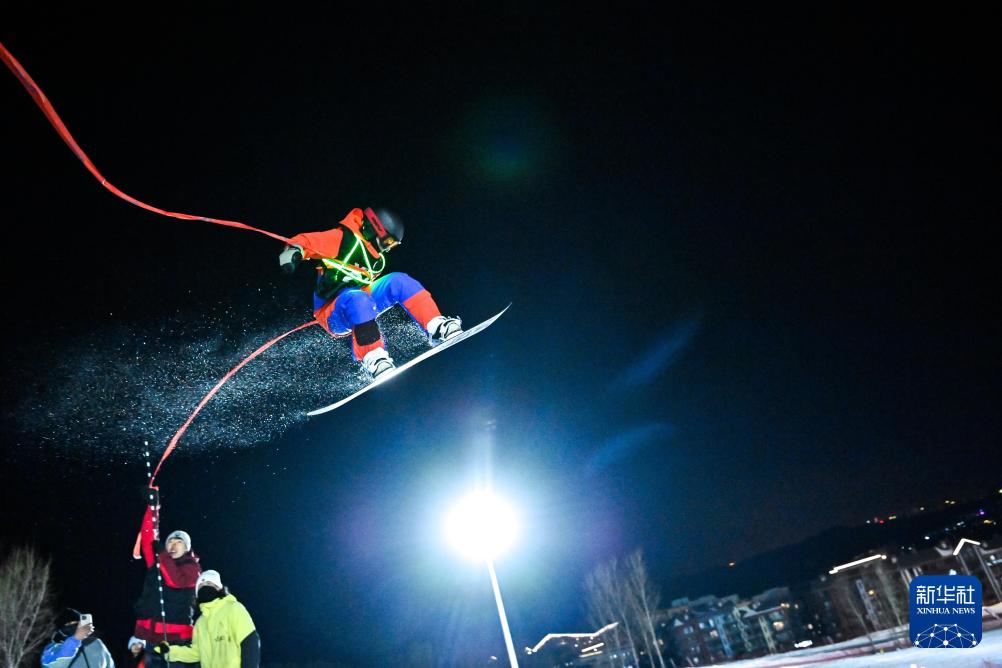 2022年12月10日,滑雪爱好者在位于吉林省吉林市的松花湖度假区V-PARK地形公园挑战跳台滑雪。新华社记者 颜麟蕴 摄