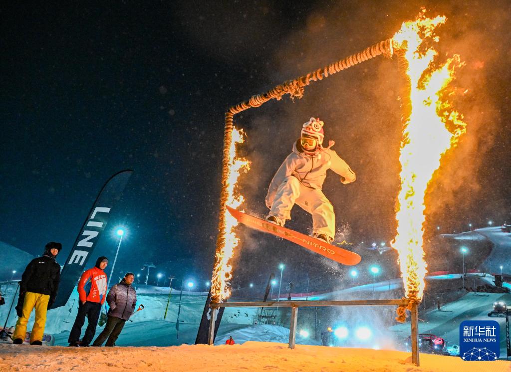 2025年1月29日,在坐落于阿勒泰市城区的新疆将军山国际滑雪度假区,雪友在新春趣味滑雪公园跳台活动中钻过火圈。新华社记者 陈朔 摄