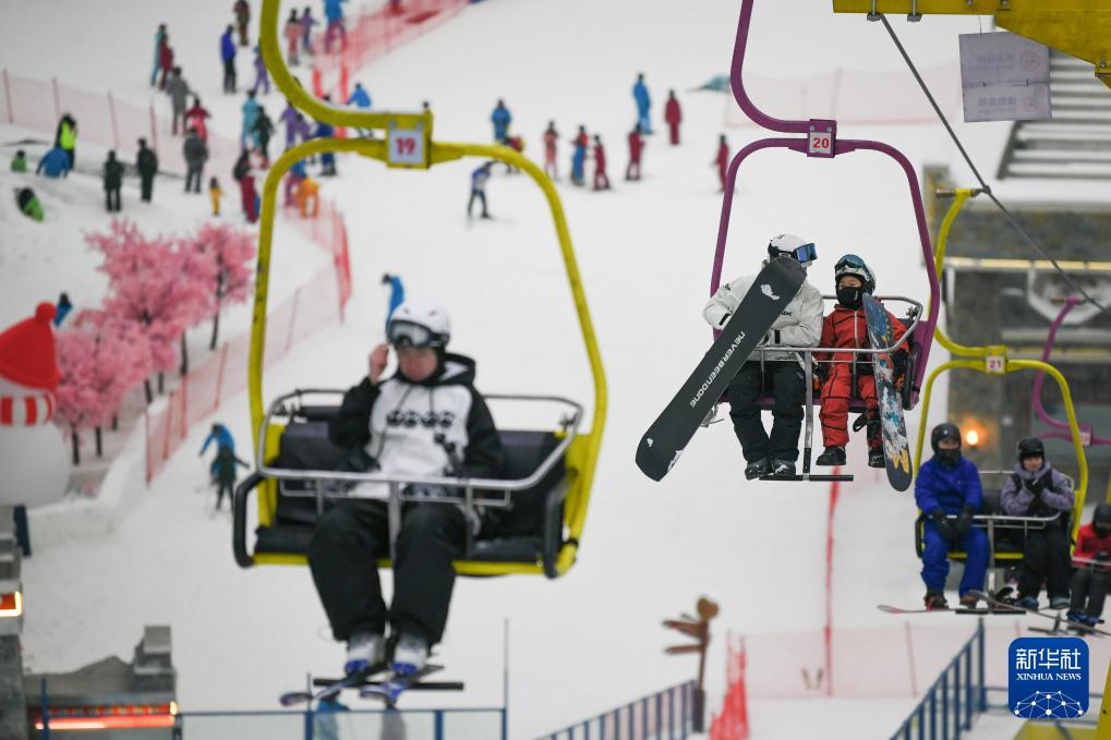 2025年1月12日,在成都热雪奇迹室内滑雪场,滑雪爱好者搭乘索道前往高级道。新华社记者 胥冰洁 摄