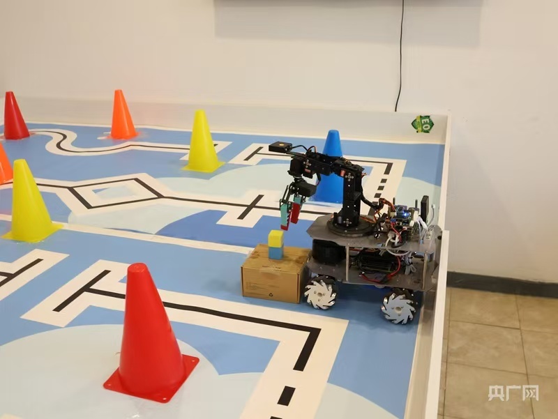 科研人员展示由“片上脑”操控的小车避开障碍物,精准抓取目标物品 (央广网发 文峰 摄)