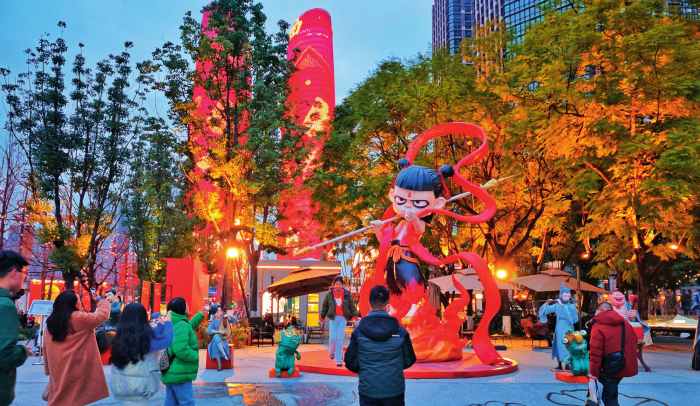 成都交子大道与益州大道交会处的哪吒主题雕塑群吸引市民打卡 (2025 年 2 月 2 日摄) 胡大田摄