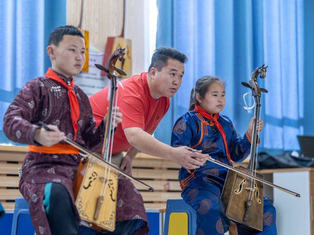 11月13日,在苏尼特右旗第五小学,乌云吉日嘎拉在指导孩子们演奏马头琴。新华社记者 马金瑞 摄