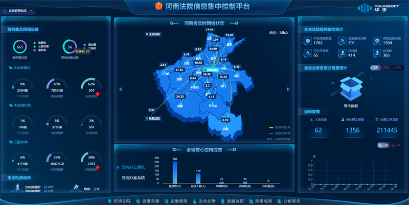 搭建信息集中控制平台,实现全流程数智化监管。依托信息技术构建“河南法院信息集中控制平台”。该平台作为“数智型”运维管理体系的核心载体,聚焦系统运行状态和应用效能,全面覆盖机房动力环境、运维支持、运维绩效、安全态势、视频监控、应用成效、分析报告等七大核心维度,致力于打造一个宏观与微观相结合、实时监管与事后分析相统一、常态管理与应急响应相协调的监管平台。