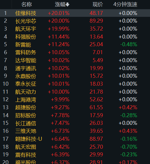 【大河财立方消息】11月25日,商业航天板块持续走强。截至午间收盘,佳缘科技、长光华芯、新雷能、雷科防务、航天环宇等涨停,翱捷科技-U、航天宏图等个股跟涨。