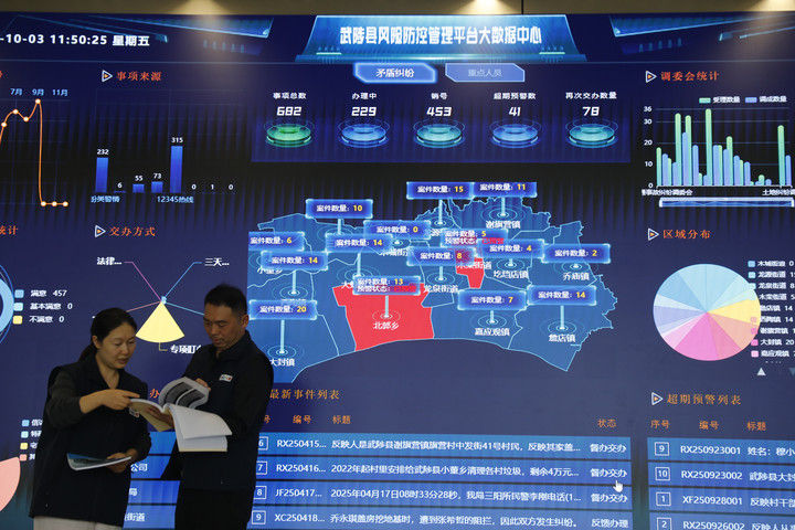 10月3日,在河南省武陟县党建引领基层高效能治理中心,工作人员通过大数据管控平台,对日常排查发现的矛盾纠纷、季节性重大风险隐患。(冯小敏 摄)