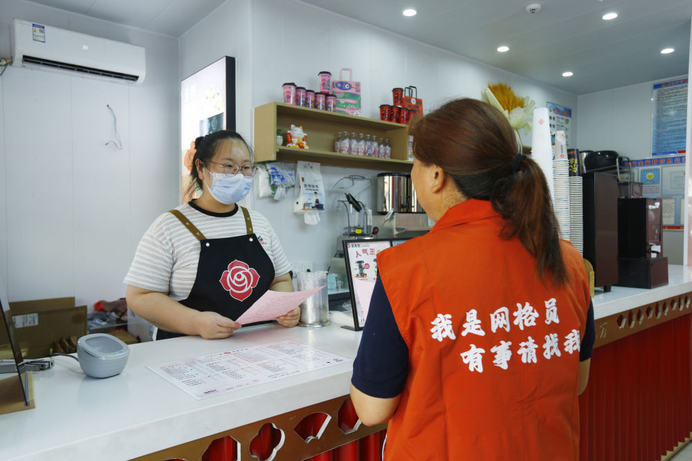 网格员在给商户宣传政策。(王小五 摄)