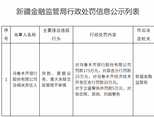 其中,新疆金融监管局对乌鲁木齐银行股份有限公司罚款175万元,对昌吉分行罚款25万元,对乌鲁木齐经济技术开发区支行罚款20万元。对于立盛警告并罚款5万元,对张忠辉、吴刚、刘娟警告。