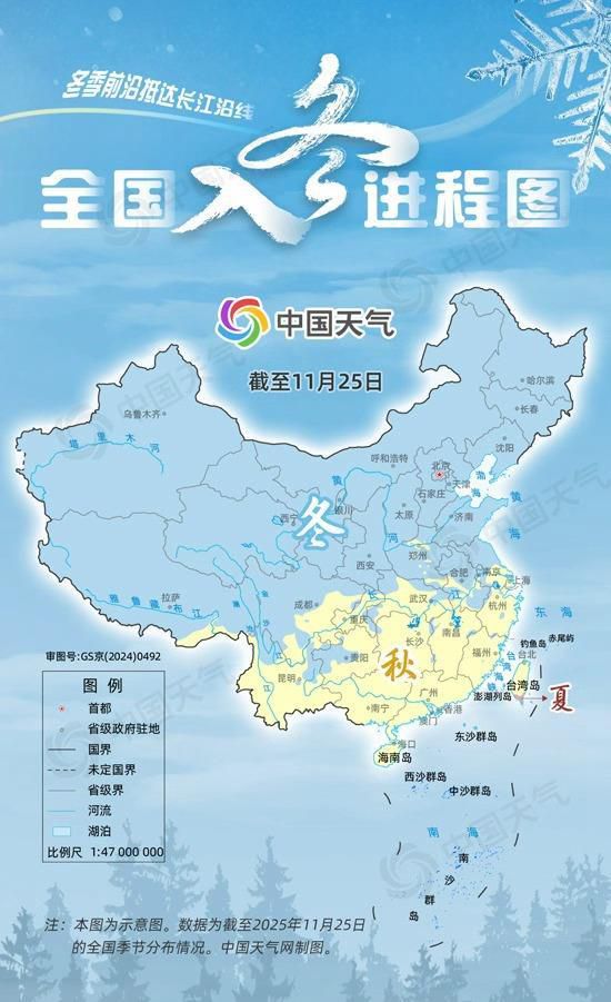 从最新全国入冬进程图来看,截至11月25日,冬季前沿已抵达长江沿线附近,江苏南部、安徽南部、湖北西南部、重庆东南部、贵州西北部、云南东北部部分地区已经入冬,冬季版图超过一半国土面积。湖南、江西、浙江、广西、广东、福建等大部地区依然处于秋天,夏天退缩到台湾岛南部。