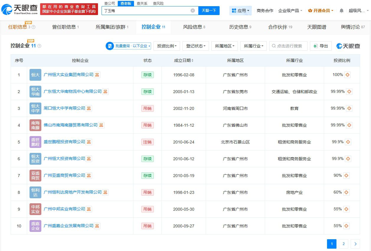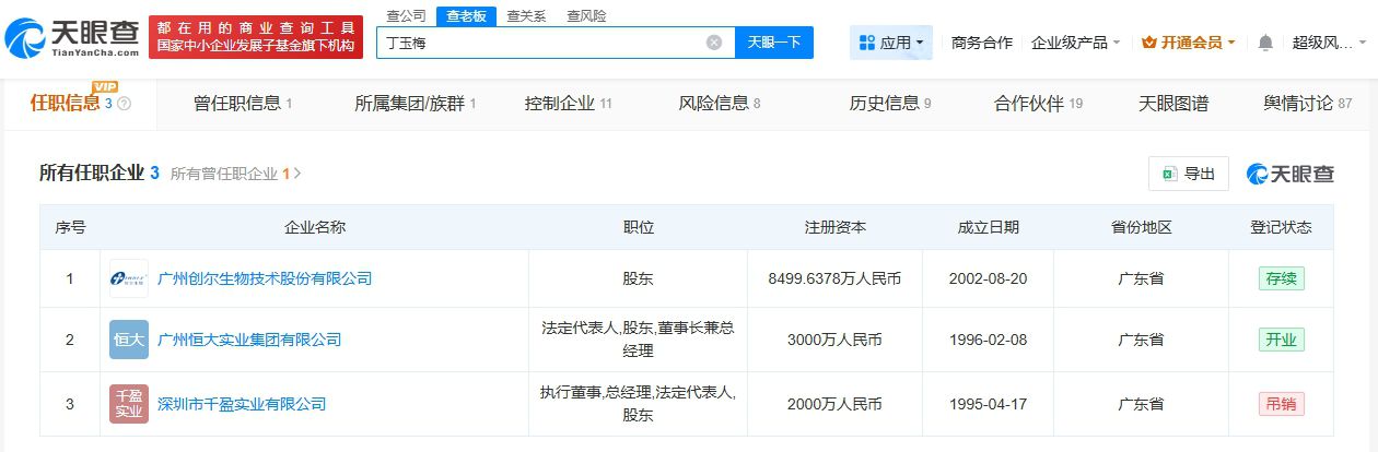 天眼查任职信息显示,丁玉梅关联3家企业,其中2家为存续或开业状态,分别为广州创尔生物技术股份有限公司、广州恒大实业集团有限公司,丁玉梅在上述企业中担任法定代表人、董事长兼总经理。通过直接或间接持股,丁玉梅拥有10余家企业的实际控制权,其中多数已被吊销或注销。