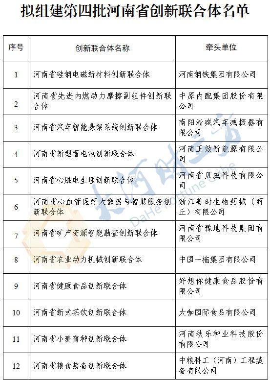 【大河财立方消息】11月27日消息,河南省科技厅公示,拟组建12家河南省创新联合体,包括河南钢铁集团牵头的河南省硅钢电磁新材料创新联合体、中国一拖集团牵头的河南省农业动力机械创新联合体、好想你牵头的河南省健康食品创新联合体、秋乐种业牵头的河南省小麦育种创新联合体等。