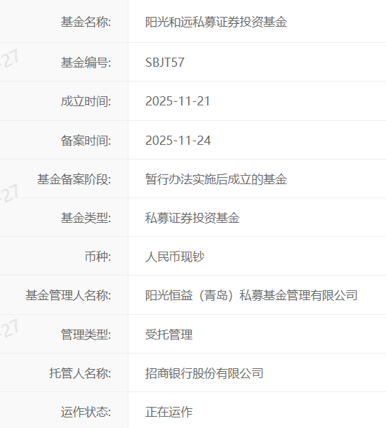 【大河财立方消息】11月27日消息,阳光和远私募证券投资基金在中基协备案,进入运作状态,这是第10只开始投资运作的险资系私募证券基金。