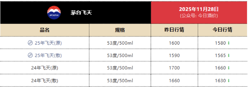【大河财立方 见习记者 关帅康】11月28日,今日酒价披露的最新批发参考价显示,2025年款53度500ml飞天茅台原箱较前一日下跌20元,报1580元/瓶;同规格飞天茅台散瓶较前一日下跌25元,报1565元/瓶。