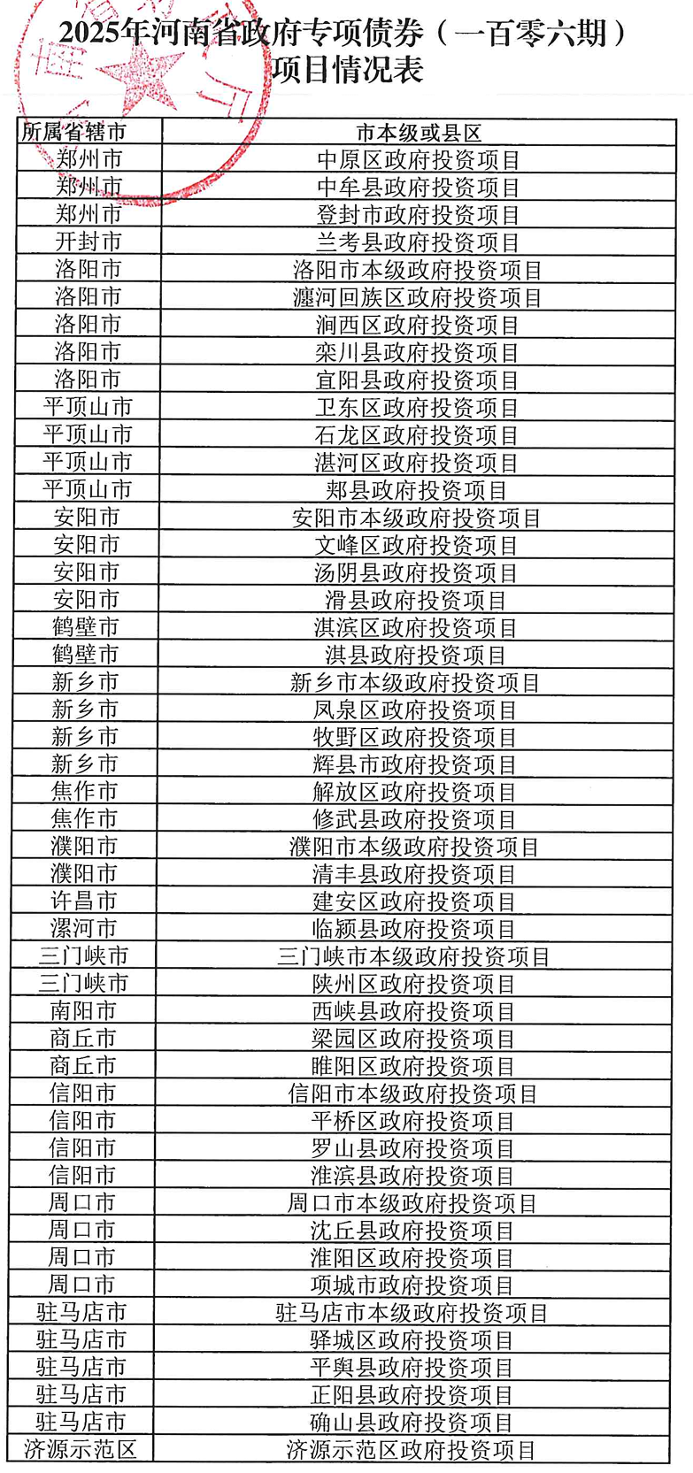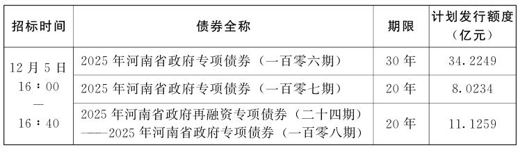 【大河财立方消息】11月28日,河南省财政厅发布通知,经河南省人民政府同意,决定发行2025年河南省政府专项债券(一百零六至一百零七期)、再融资专项债券(二十四期),总额为53.3742亿元。