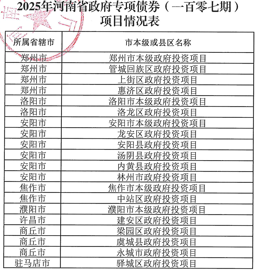资金投向方面,2025年河南省政府再融资专项债券(二十四期),用于置换存量隐性债务。2025年河南省政府专项债券(一百零六期)、2025年河南省政府专项债券(一百零七期)投向如下:
