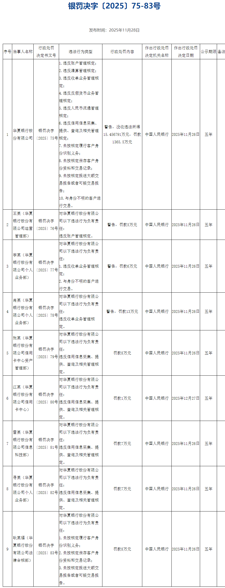 中国人民银行对华夏银行警告,没收违法所得15.456791万元,罚款1365.5万元。