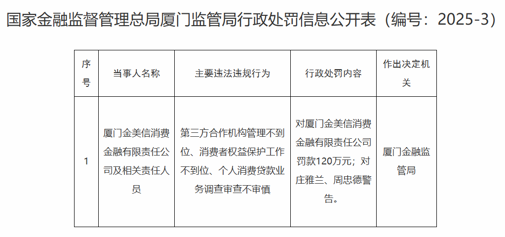 【大河财立方消息】12月1日,国家金融监督管理总局厦门监管局行政处罚信息公开表显示,因第三方合作机构管理不到位、消费者权益保护工作不到位、个人消费贷款业务调查审查不审慎,厦门金美信消费金融有限责任公司被罚120万元。