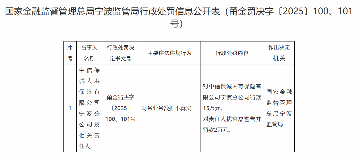 【大河财立方消息】12月1日,国家金融监督管理总局宁波监管局披露的行政处罚信息公开表显示,因财务业务数据不真实,中信保诚人寿保险有限公司宁波分公司被罚15万元。