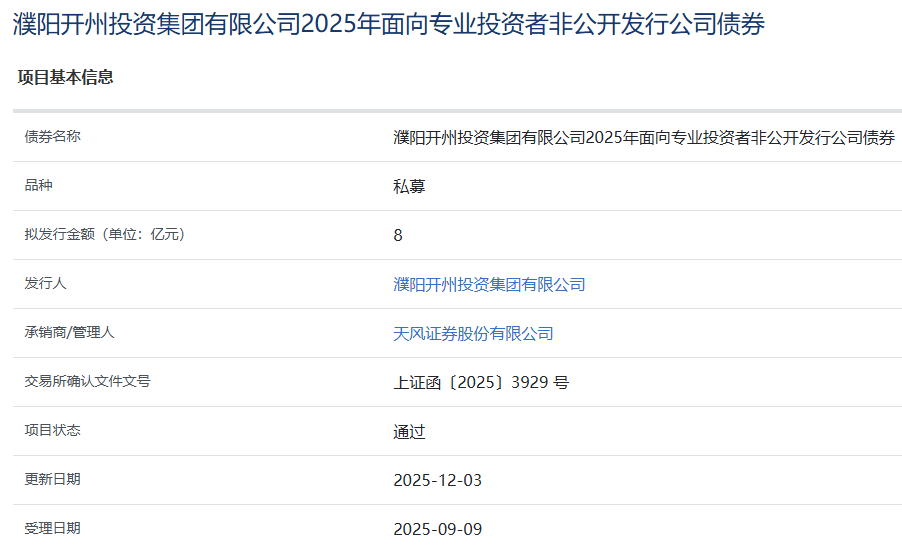 【大河财立方消息】12月3日,濮阳开州投资集团有限公司2025年面向专业投资者非公开发行公司债券获上交所通过。该债券拟发行金额8亿元,承销商/管理人为天风证券。2025年6月30日,经中证鹏元综合评定,发行人主体信用评级为AA,评级展望稳定。
