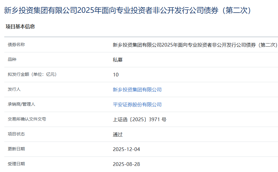 【大河财立方消息】12月4日,新乡投资集团有限公司2025年面向专业投资者非公开发行公司债券(第二次)获上交所通过。该债券拟发行金额10亿元,承销商/管理人为平安证券。