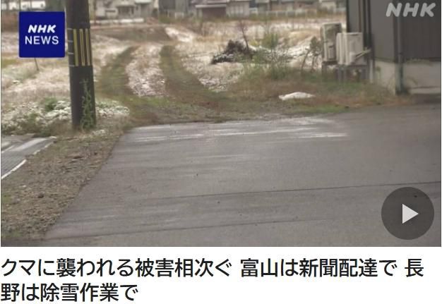 同日,长野县一位78岁的男性在家门前除雪时,也遭到熊袭击,致其脸部和大腿等部位受伤。目前,警方已呼吁附近居民注意安全。