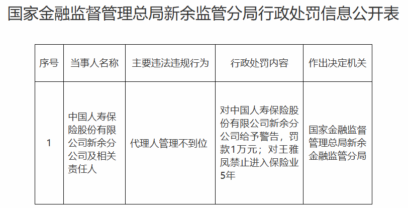 同时,国家金融监督管理总局新余金融监管分局对相关责任人王雅凤禁止进入保险业5年。
