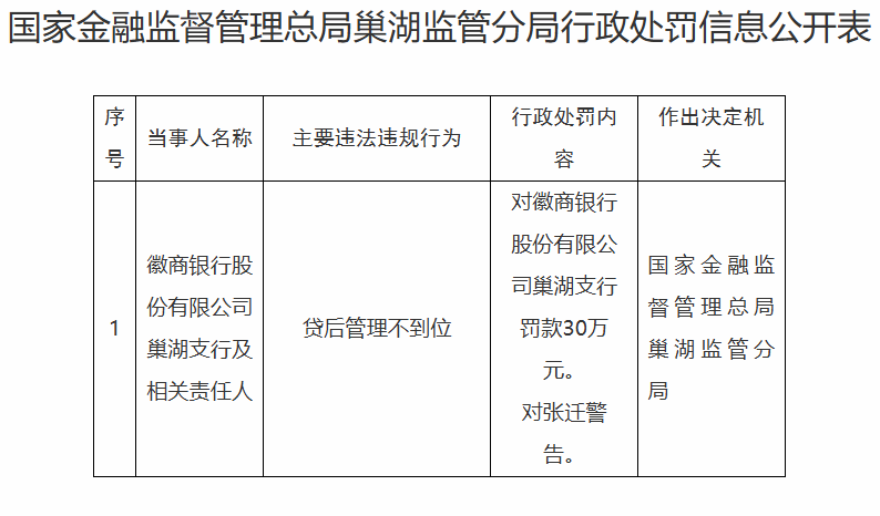 【大河财立方消息】12月6日消息,国家金融监督管理总局巢湖监管分局披露的行政处罚信息公开表显示,因贷后管理不到位,徽商银行股份有限公司巢湖支行被罚30万元。