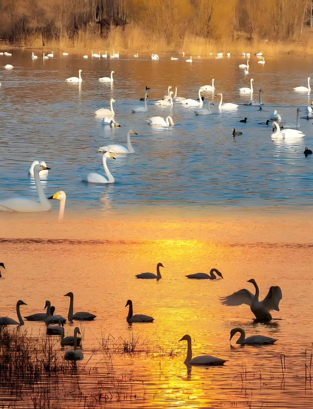成千上万只白天鹅在光影中起舞。