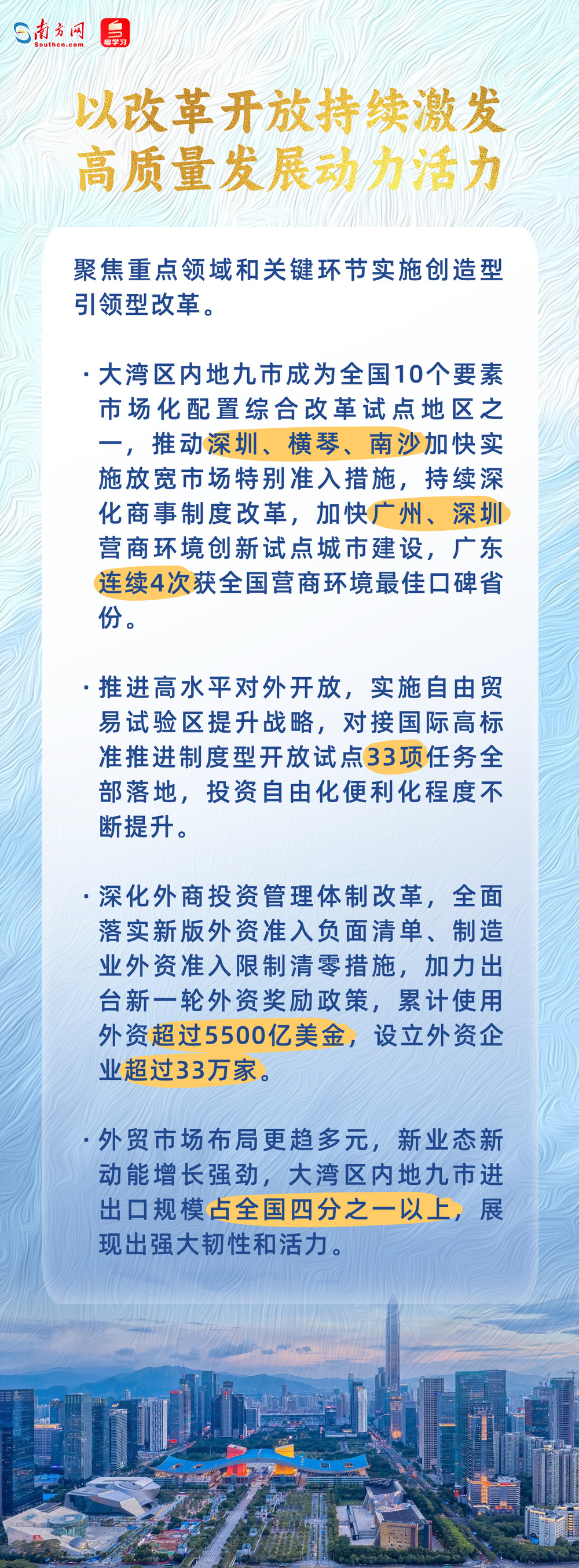 大湾区内地九市是粤港澳大湾区经济重要增长极,也是广东经济的“压舱石”,其发展态势对大湾区整体高质量发展具有关键作用,并深刻影响着广东乃至全国经济格局。多年来,大湾区内地九市以打造世界级城市群为目标,锐意改革、敢闯敢试,推动经济规模不断壮大、产业体系不断健全、创新活力不断激发、城市体系不断优化,为全国城市群高质量发展提供了示范样本。