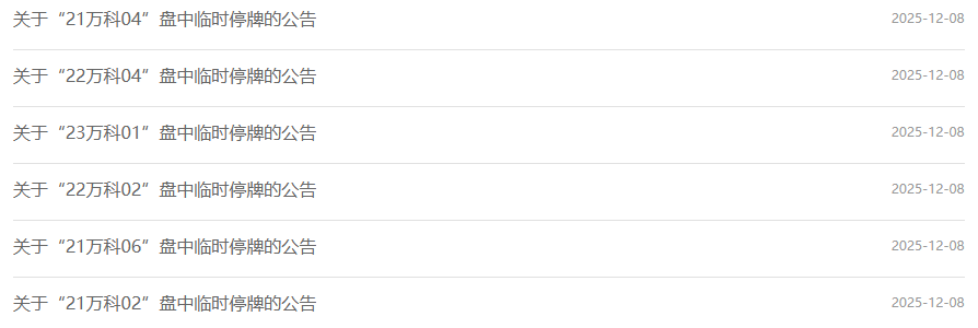 【大河财立方消息】12月8日,深交所发布公告称,因“21万科02”等债券盘中成交价较前收盘价首次上涨达到或超过20%,根据有关规定,深交所对相关债券实施临时停牌。