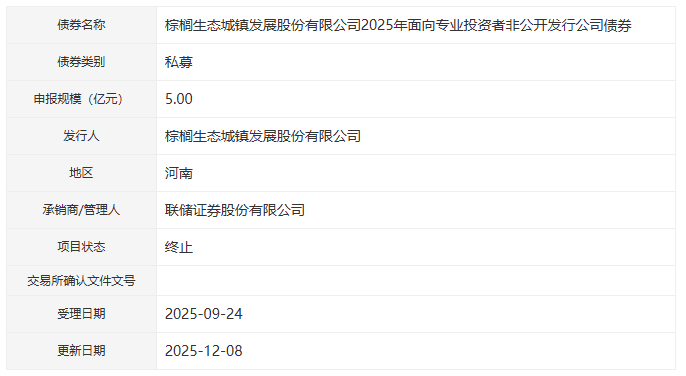 【大河财立方消息】12月9日消息,据深交所披露,棕榈生态城镇发展股份有限公司2025年面向专业投资者非公开发行公司债券项目状态更新为“终止”,拟发行金额为5亿元,品种为私募,承销商/管理人为联储证券,受理日期为2025年9月24日。