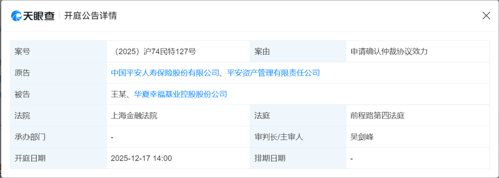 【大河财立方消息】12月10日,天眼查信息显示,平安人寿及平安资产作为原告起诉华夏幸福基业控股股份公司及“王某”,案由为“申请确认仲裁协议效力”,上诉法院为上海金融法院,开庭日期为12月17日。