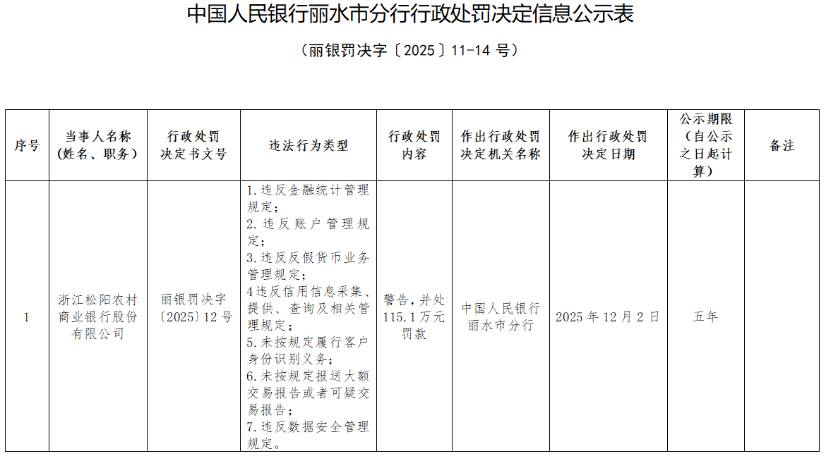 【大河财立方消息】12月11日消息,中国人民银行丽水市分行日前披露的行政处罚决定信息显示,浙江松阳农村商业银行股份有限公司被警告,并处115.1万元罚款。