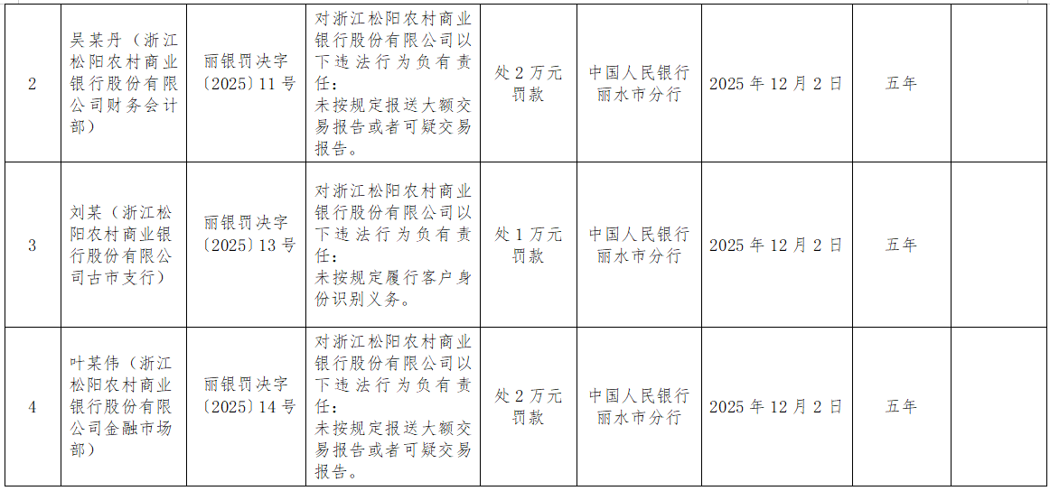 同时,浙江松阳农村商业银行财务会计部吴某丹因对未按规定报送大额交易报告或者可疑交易报告的违法行为负有责任,被处2万元罚款;