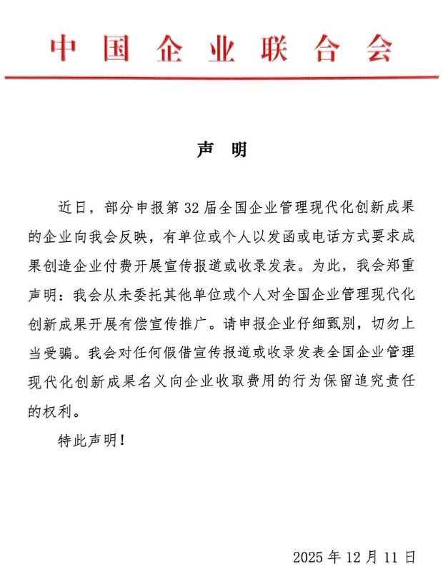 【大河财立方消息】12月11日,中国企业联合会发布声明称,近日,部分申报第32届全国企业管理现代化创新成果的企业向中国企业联合会反映,有单位或个人以发函或电话方式要求成果创造企业付费开展宣传报道或收录发表。为此,中国企业联合会郑重声明: