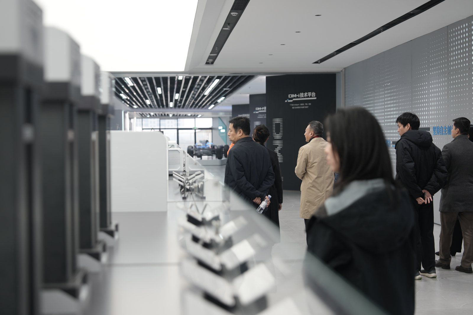 在展示中心,高管们看到了比亚迪从电池、电机到整车的多种产品线。其中,最引人注目的是中央展台上一台被“解剖”的比亚迪海豹电动汽车。面对这个内部结构一目了然的大“玩具”,他们纷纷拿出手机记录。