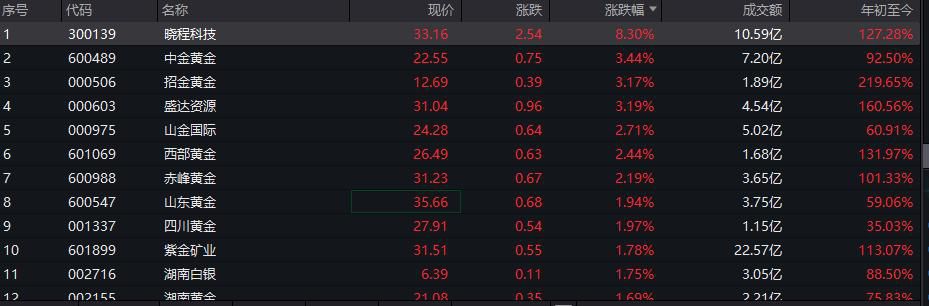 贵金属板块集体高开,晓程科技涨超8%,中金黄金、山金国际、招金黄金、西部黄金、山东黄金等跟涨。