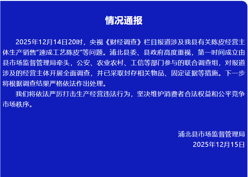 【大河财立方消息】12月15日,广西浦北县市场监督管理局发布情况通报称,央视《财经调查》栏目报道涉及浦北县有关陈皮经营主体生产销售“速成工艺陈皮”等问题。浦北县委、县政府高度重视,第一时间成立由县市场监督管理局牵头,公安、农业农村、工信等部门参与的联合调查组,对报道涉及的经营主体开展全面调查,并已采取封存相关物品、固定证据等措施。