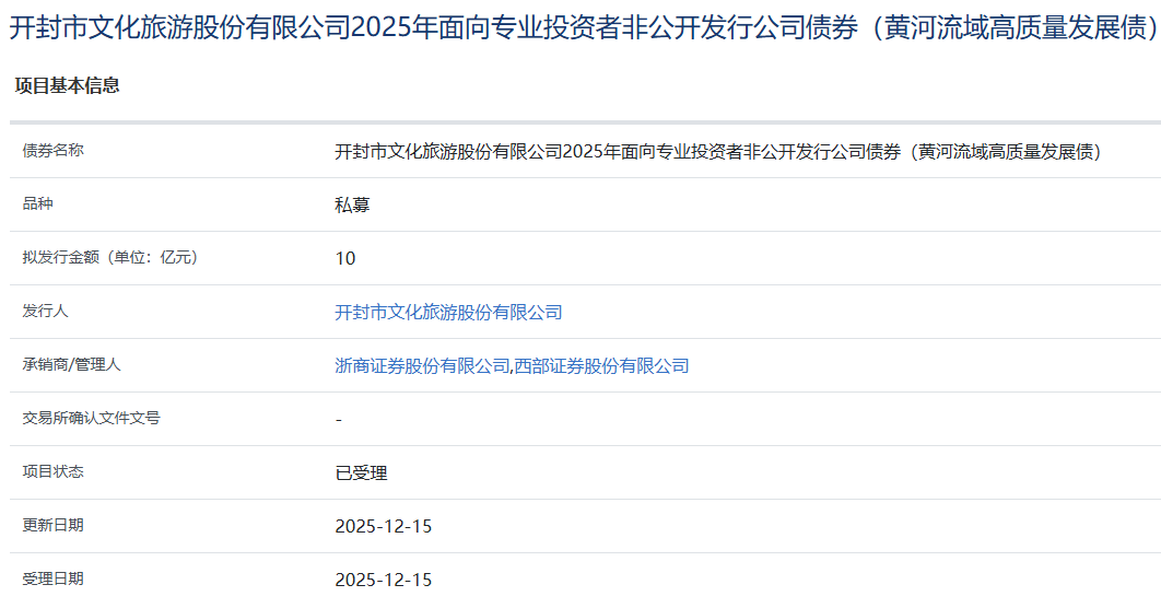 【大河财立方消息】12月16日消息,开封市文化旅游股份有限公司2025年面向专业投资者非公开发行公司债券(黄河流域高质量发展债)项目获上交所受理。