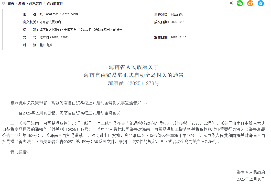 通告称,自2025年12月18日起,海南自由贸易港正式启动全岛封关。